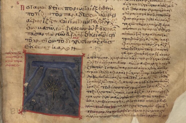 […] [Moise] s-a apucat apoi să scrie despre rîul care curgea din paradis și care, odată ieșit din acesta, se împărțea în patru fluvii distincte, spunând: „Un râu iese din Eden ca să ude raiul”.